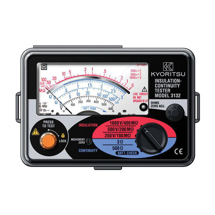 میگر KYORITSU 3132A با بدنه محکم و غیر قابل نفوذ در برابر رطوبت و گرد و خاک مطابق با استاندارد های ایمنی IEC 61010-1 و IEC 61557 طراحی و ساخته شده است. این میگر در حالت اتصال کمترین مقاومت دارای جریان 1 میلی آمپر و در حالت تست اتصال کوتاه جریان 200 میلی آمپر را به مدار میدهد. این میگر با ولتاژ تست 1 کیلو میتواند تا رنج 400 مگا اهم را اندازه گیری کند. این میگر عقربه ای کوچک و سبک قابلیت اندازه گیری ولتاژ تا 600 ولت AC را دارد